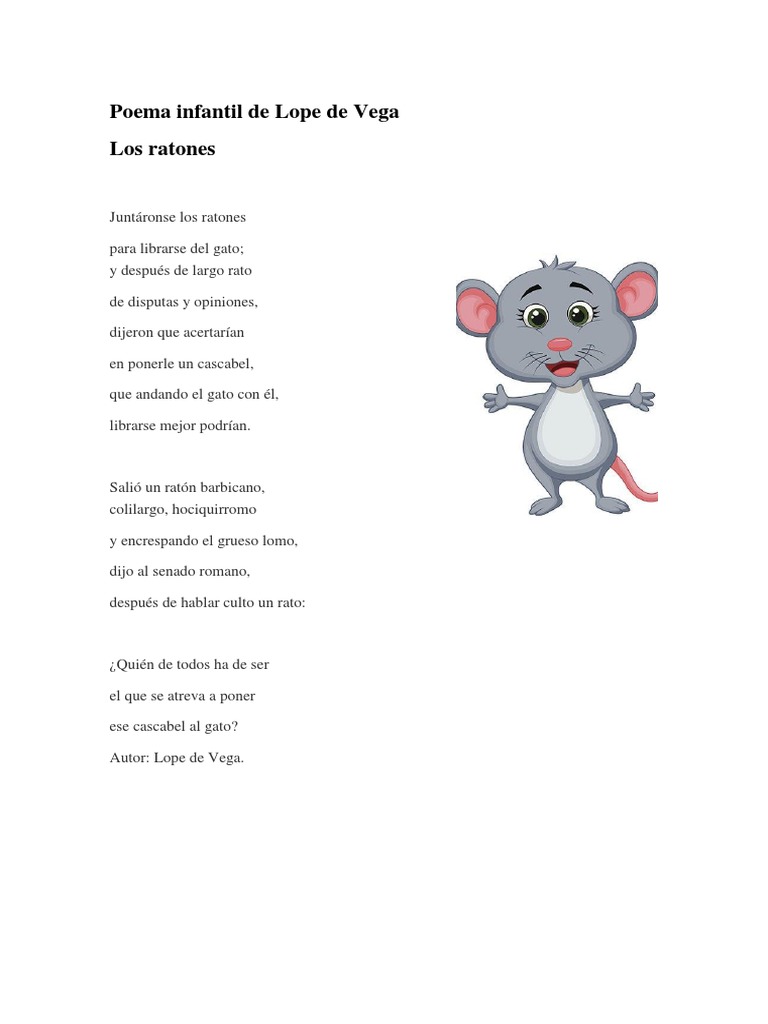 Lope Félix de Vega Carpio más conocido como Lope de Vega es considerado como uno de los más reconocidos y admirados poetas y dramaturgos del conocido Siglo de Oro Español el cual alcanzó una amplia recepción internacional gracias a sus obrasFue conocido por expresar en todo momento posible su pasión por la literatura y la poesía así como por plasmar sus. De disputas y opiniones dijeron que acertarían. Los ratones de Lope de Vega. Salió un ratón barbicano colilargo hociquirromo. Y después de largo rato de disputas y opiniones dijeron que acertarían en ponerle un cascabel que andando el gato con él librarse mejor podrían. Poema de Lope de Vega para leer a los niños. Y después de largo rato.