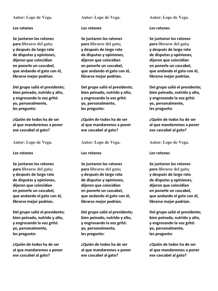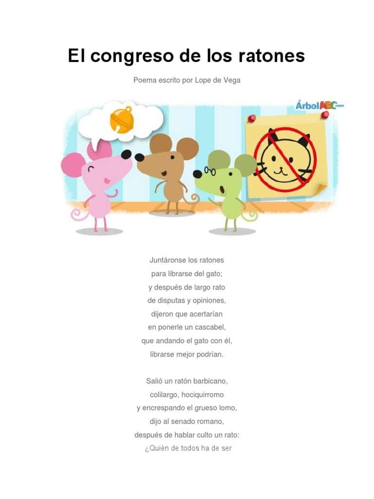 De disputas y opiniones dijeron que acertarían. En ponerle un cascabel Que andando el. Y después de largo rato de disputas y opiniones dijeron que acertarían en ponerle un cascabel qué andando el gato con él librarse mejor podrían. Para librarse del gato. Y después de largo rato de disputas y opiniones dijeron que acertarían en ponerle un cascabel que andando el gato con él librarse mejor podrían. En ponerle un cascabel que andando el gato con él librarse mejor podrían. Y sobre todo divertirse. 9 poemas cortos para leer a los niños. Juntáronse los ratones Para librarse del gato.